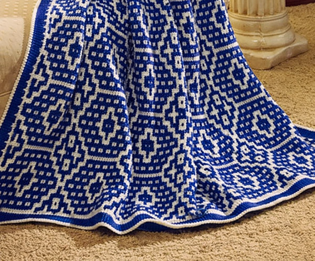 The Pottery Throw stands out because of its bold symmetrical motifs that resemble carved pottery or ceramic tile patterns. When worked in deep red and soft white, the blanket creates a dramatic contrast that highlights every detail of the mosaic pattern.